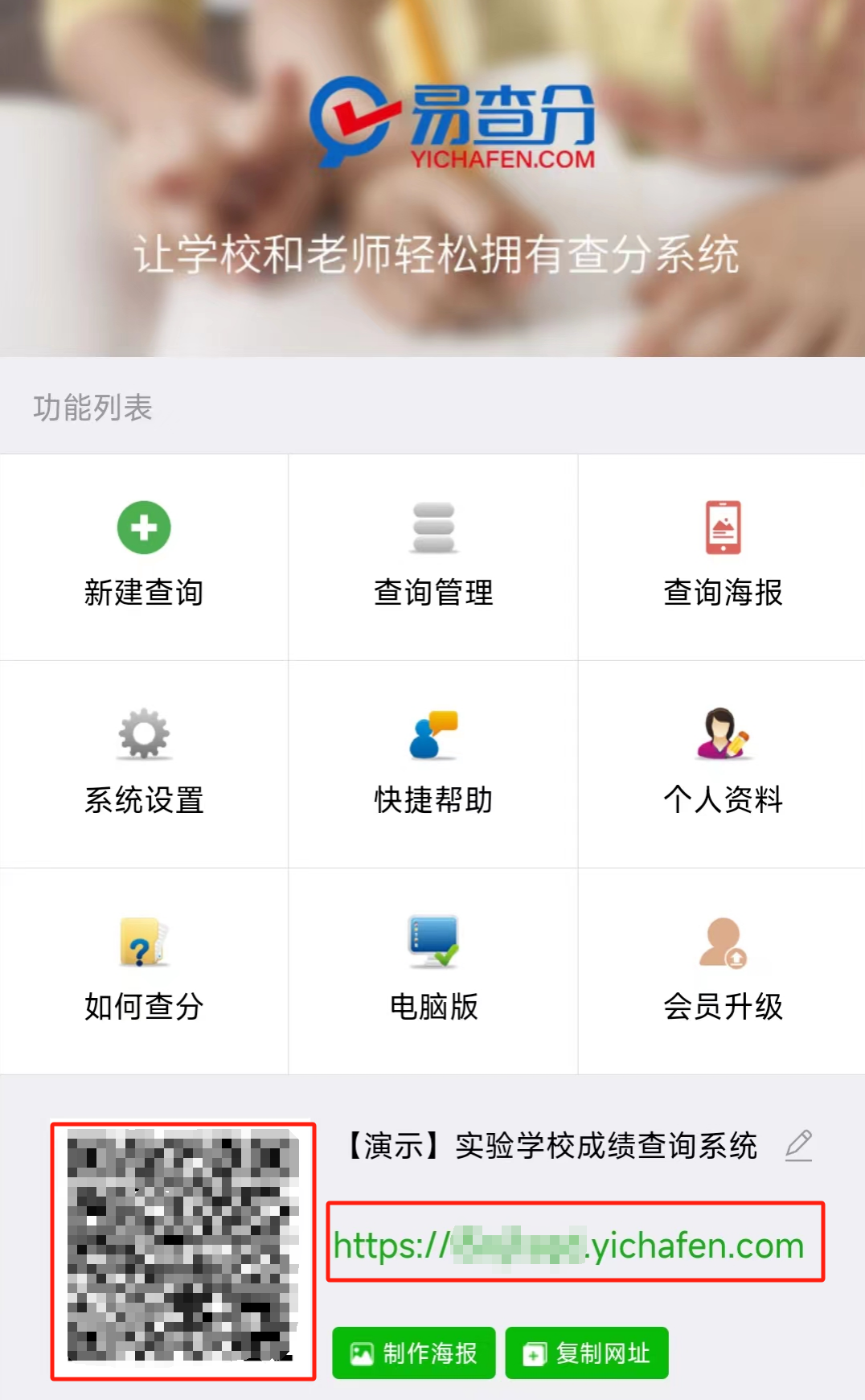当您注册易查分后,会获得一个查询网址,同时还有一个查询微信二维码,您可以将专用查询网址或者二维码发给学生,让学生查询,具体发布方法请往下看。