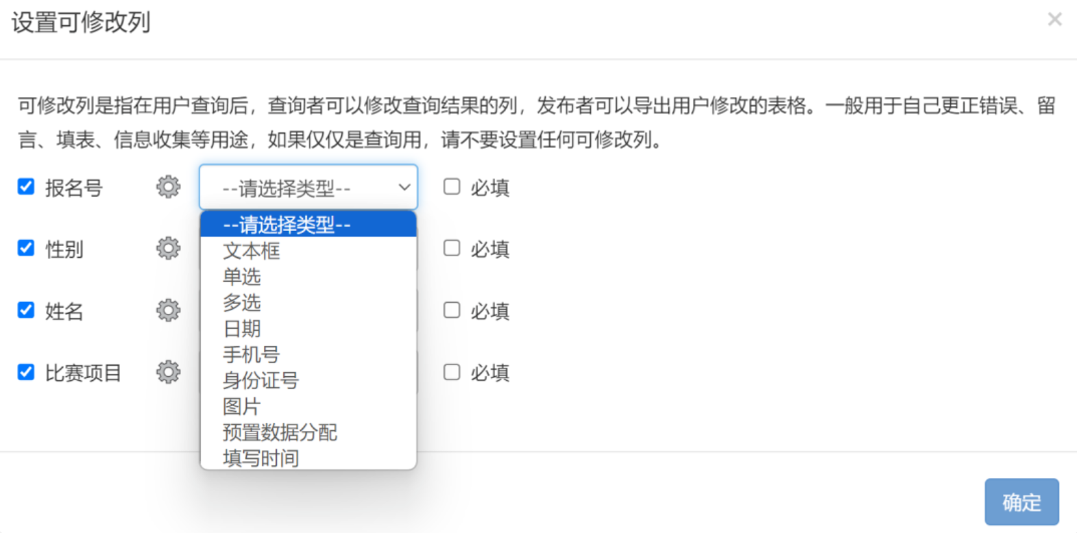 开启无条件填表功能后,点击设置可修改列,将所有列都设置为可修改列,并根据需求选择填表类型。(如报名号可选预置数据分配,性别可设置单选,比赛项目可设置单选或多选)