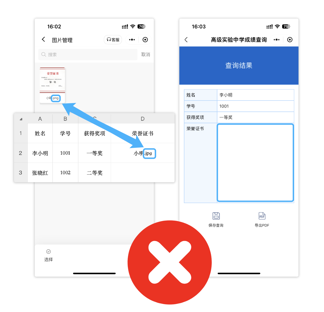 ②任何单元格都可以显示图片:易查分支持任何列、单元格显示图片,无需专门设置图片列。