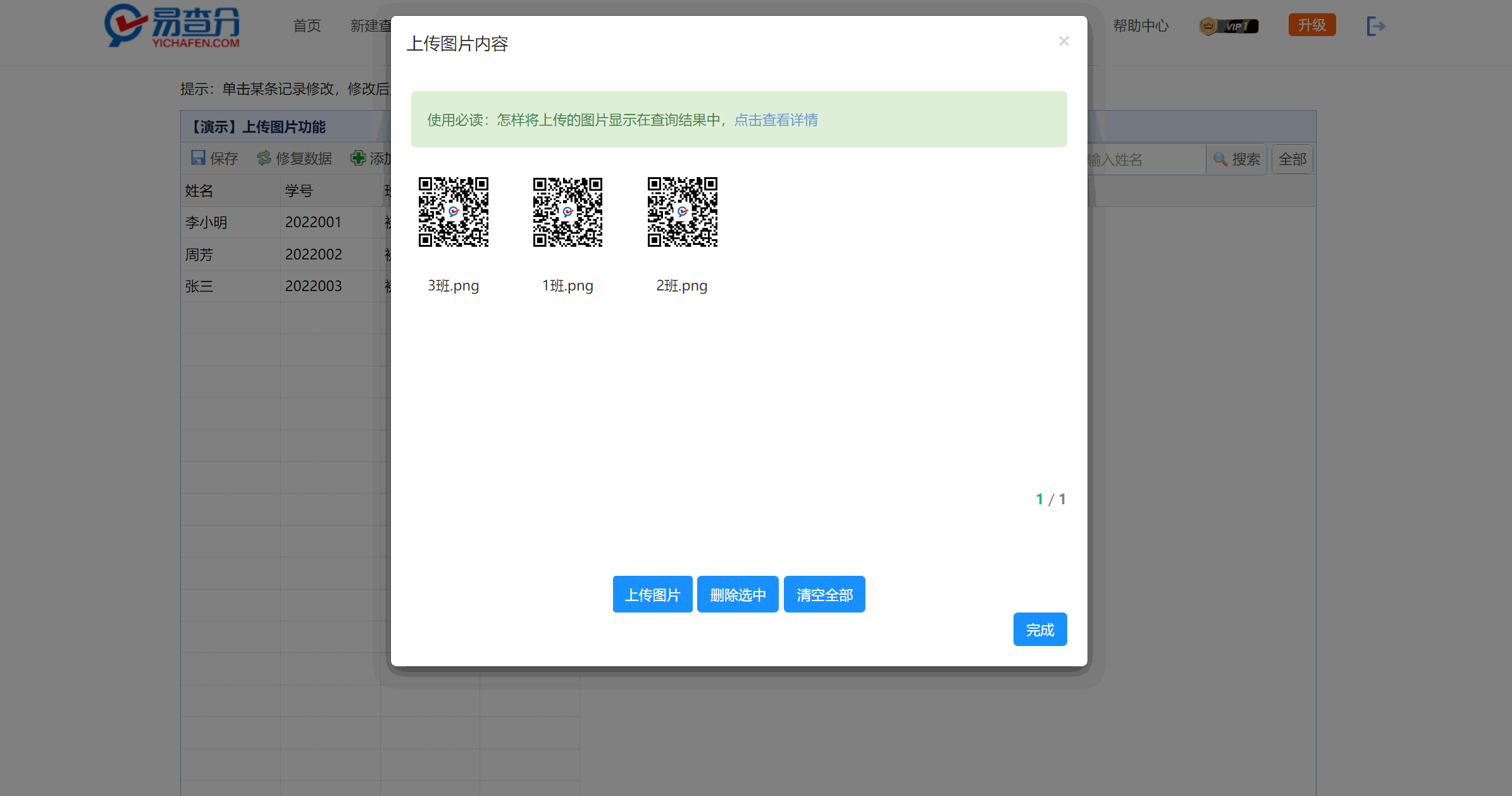 大家在使用易查分制作查询系统时,可能会有在查询结果页面展示图片的需求;比如我们在制作分班查询系统、个人资料查询系统、大赛获奖查询系统等查询系统时,需要在查询结果中展示班级群二维码、一寸照片、作品图片(如下图演示)。易查分上传图片内容功能,即可实现查询结果图片的展示。