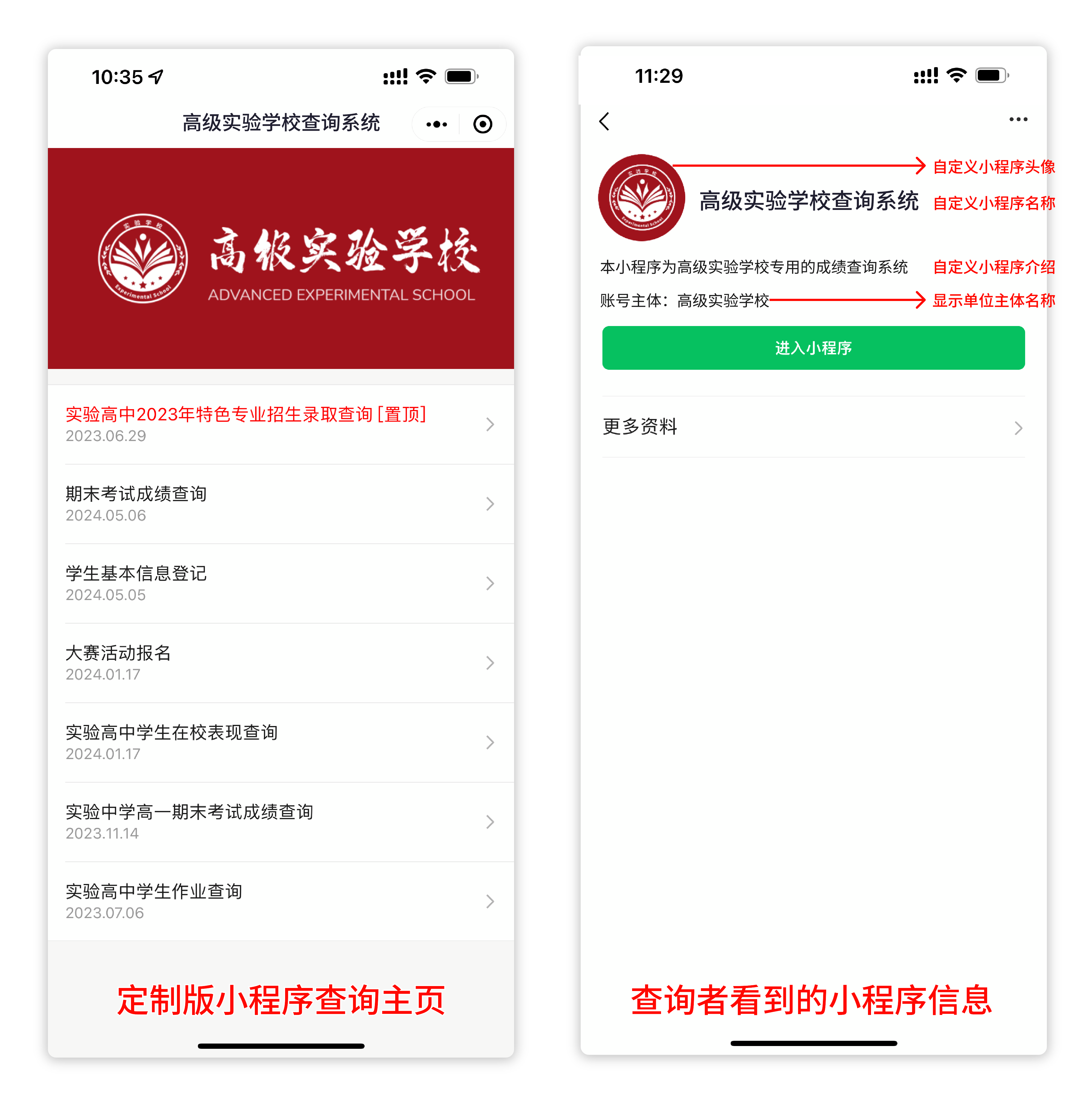 2、单位官方查询小程序,小程序图标、名称、单位均可自定义,更具权威性。