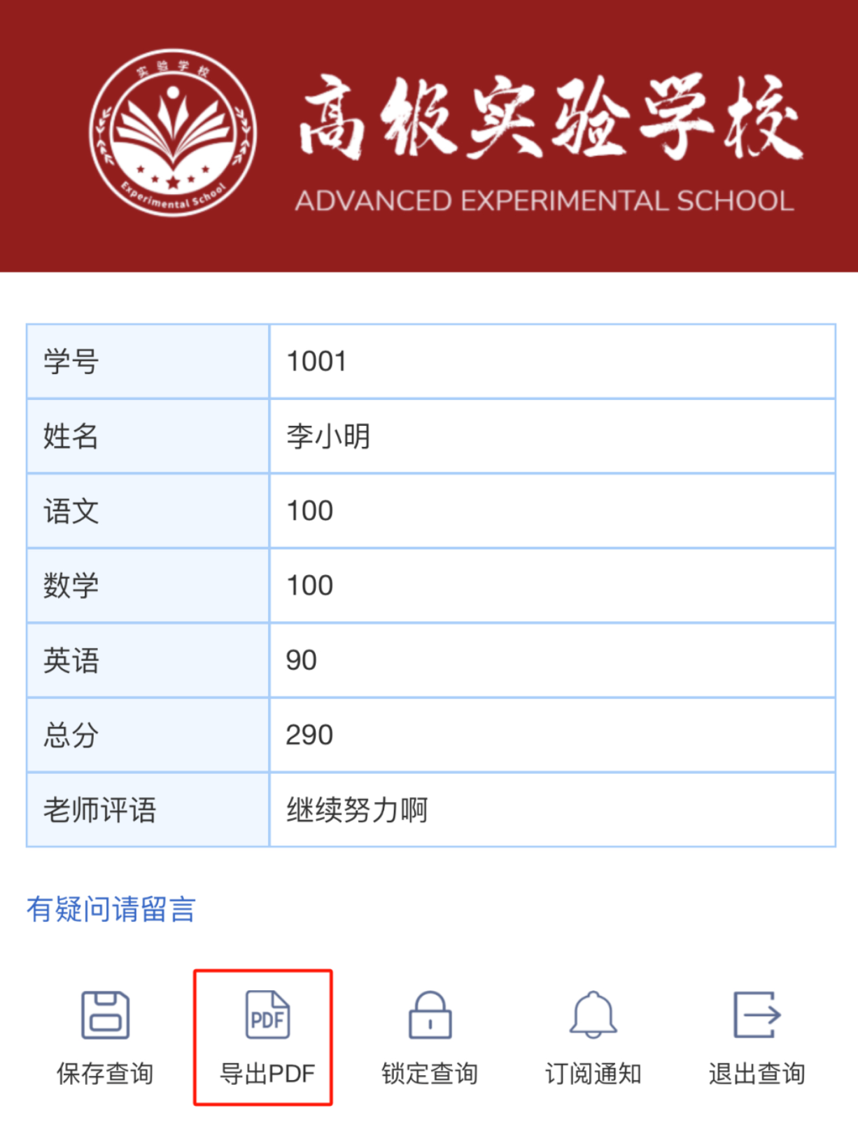 易查分的保存查询功能可以让查询者在不进入查询的情况下即可查看历史查询结果。导出PDF文件功能可以将查询结果下载到本地,也可用于打印出纸质资料。