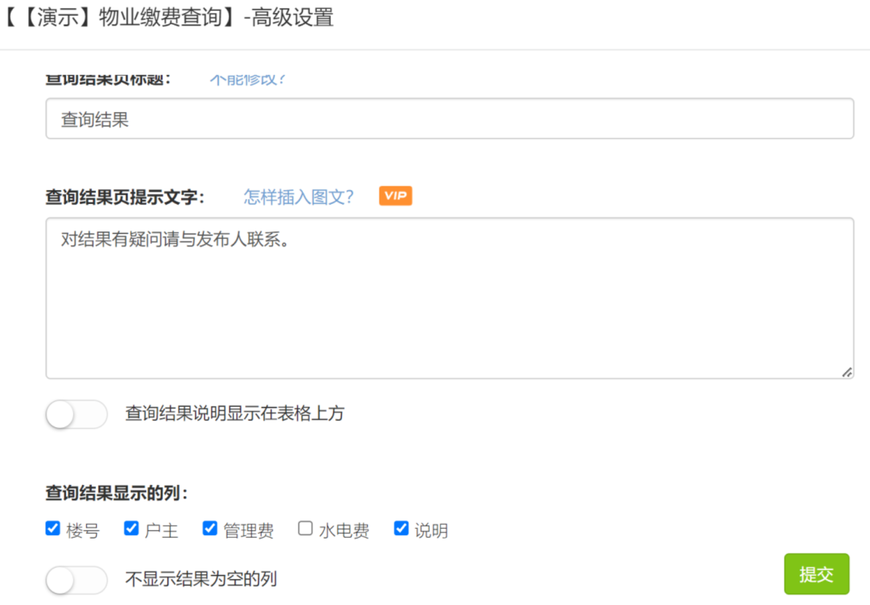 创建完成后,进入查询管理-高级设置-查询结果,将不需要在查询结果展示的项目勾选去掉(如:水电费暂未出账单,不展示在查询结果页面,这里不勾选水电费即可),最后点击提交即可完成设置。